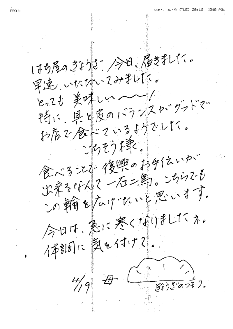はちやの餃子物語 今日もうれしいお客様からのご感想!!「美味しい餃子を贈って、喜んでもらいましょう!」 更新日: 2014年4月24日2011年4月23日コメントをどうぞ (今日もうれしいお客様からのご感想!!「美味しい餃子を贈って、喜んでもらいましょう!」) お客様が実家に「復興がんばろう!餃子セット」を送り、そのお礼で届いたFAXです。 贈り物としても、弊社のおいしい餃子は喜ばれています!! お取り寄せをして自分で食べてもうれしく、贈ってもうれしい。そんな「はちやの餃子」。 ぜひ、あなたもご賞味ください!! ○ あなたの声をお聞かせください! 投稿はこちらから ⇒ info☆hachiya-foods.co.jp(☆を@に変えてお送りください) 皆様からの声が私たちの活力です!